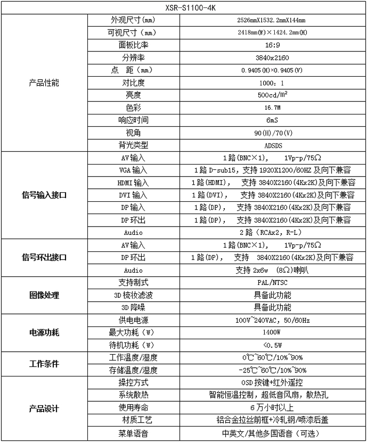 XSR-S1100-4K是新視銳一款110寸4K超高清液晶監(jiān)視器,分辨率為3840px ×2160px;其采用國際知名品牌液晶面板(如:LG、三星、夏普等)、頂級元器件材料,支持7x24小時不間斷運行,壽命高達(dá)60000小時;其搭載世界先進(jìn)的視頻圖象處理芯片;自動色彩引擎CMM-6,確保色彩還原達(dá)到極至;支持多種信號輸入、環(huán)出。