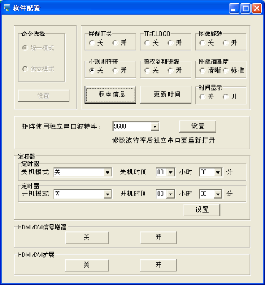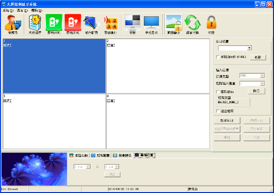 解壓拼接控制軟件、RAR得到以下三個文件:userlogo、VGA自動調(diào)整圖片、串口調(diào)試、LCDWall.exe、LcdWall.exe.manifest、MWS_Cfg.ini,該控制軟件為綠色版,無需安裝,直接運行Lcdwall軟件.exe,彈出如圖1控制界面。(注:所有操作必須在串口打開才能操作)