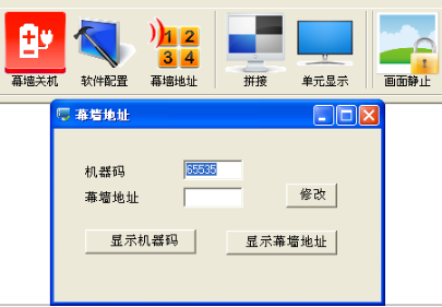 例如以2X2拼接幕為列從左到右數(shù)如圖11中的機器碼15569顯示的是第四塊屏幕,那么就把15569填寫到機器碼框中.幕墻地址框中就改成4,點擊修改,然后關(guān)掉完成再進行下一個修改.