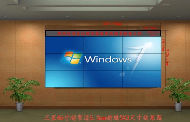 拼接墻的大小由幕墻單元的個數 (長M×高N) 和單元的尺寸來計算。例如3行x3列 46″超窄邊拼接墻共9個46″窄邊拼接單元組成,其大致尺寸及占用空間計算如下: